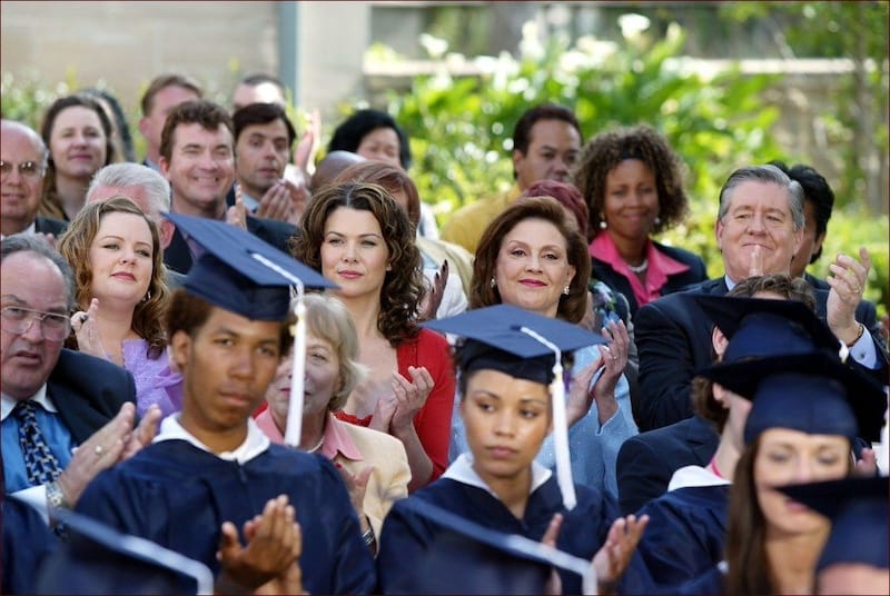 - I love that Lorelai claims to have lost Rory in the "sea of blue polyester" when there are maybe forty kids at this graduation. The WB really splurged on the extras budget for this finale.