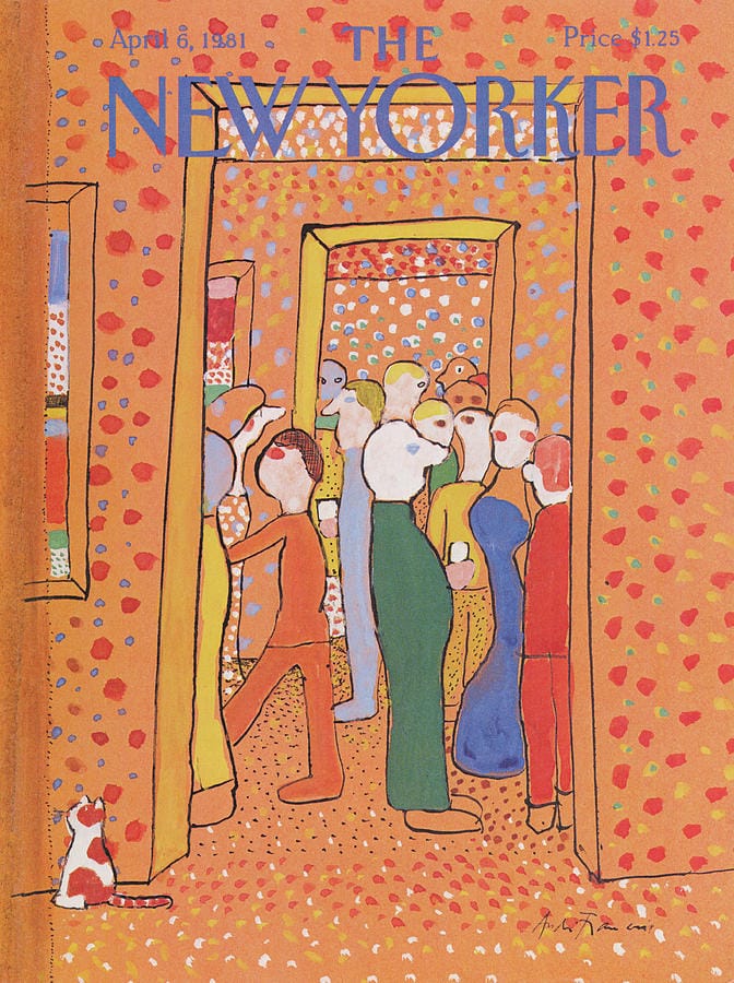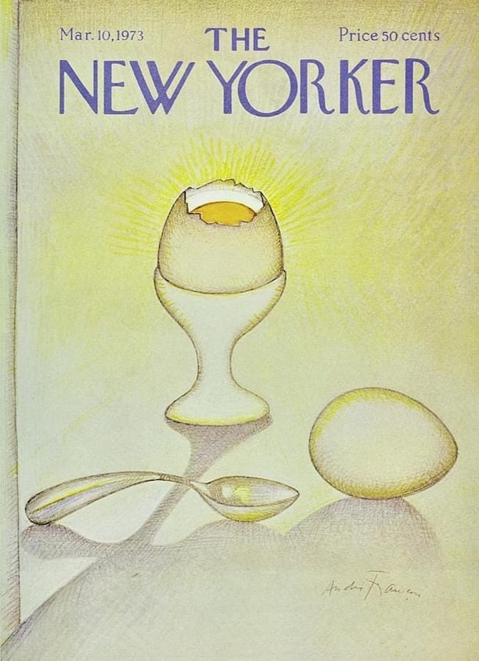 What I found is that François was born in Timisoara — then part of Hungary, now Romania — and moved to Paris in his late teens/early 20s. He became a citizen, changed his last name (from Farkas to François, he was Jewish), and started taking on freelance cartoon work. During WWII, he and his family (by then, a wife and two kids) obtained false papers and moved to the Alps in eastern France. Did he and Alois Carigiet know each other? I'm not 100% sure, but probably! Eventually, he moved to Grisy-les-Plâtres outside of Paris. During this time, he began illustrating children's books and doing work for prominent magazines like Punch, Lilliput, and The New Yorker. Between 1963 and 1991, he illustrated 56 New Yorker covers. These two are my favorites: