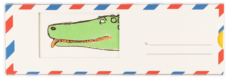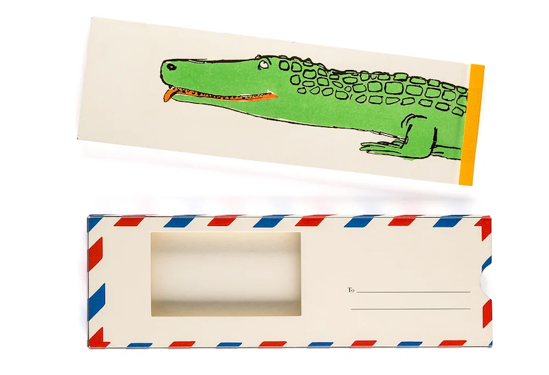 While he often worked with other writers, he also wrote many books himself, including "Crocodile Tears." It wasn't originally presented like this, but the version I saw, reprinted by Enchanted Lion Books, is a long, thin volume, perfectly slotted into an airmail box.