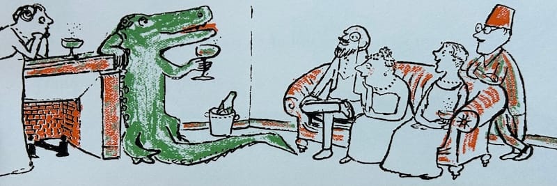 The story inside is simple: a kid accused of crying crocodile tears asks what they are and his dad (grandpa?) spins up some fantastical nonsense involving a trip to Egypt, rousing cocktail hours, and a crocodile-drawn carriage.