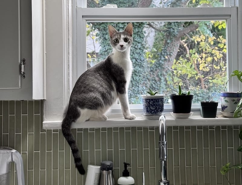 My foster cat is still kitten-less and getting bolder by the day. She has made some truly insane leaps for a gal holding 70% of her body weight in her lower half. I'm including a photo because I can't help myself, but it is unauthorized and I will be punished.
