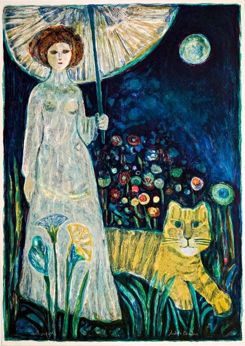 Among many cool jobs, Bledsoe worked as a children's book illustrator and created live drawings for children's programming on BBC-TV. Her work is whimsical, colorful, and habitually features cats, so I am spiritually predisposed to enjoy it. Here are two more pieces I dig: