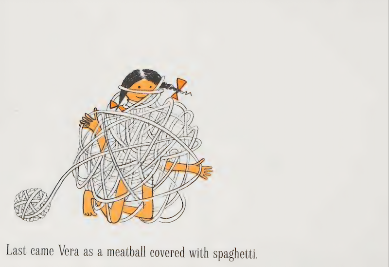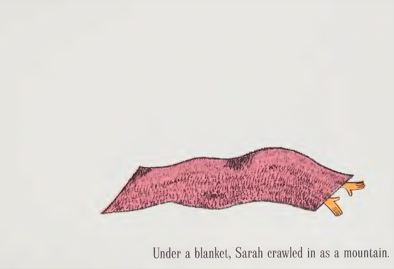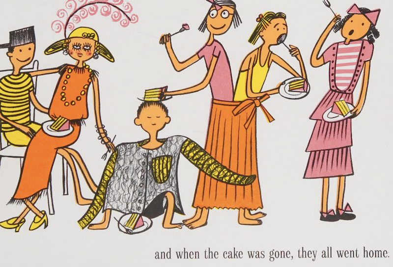 As a palate cleanser, here are some illustrations from Remy Charlip's "Let's Have a Party" (1956), a book about a bunch of kids who come over to John's house in fanciful outfits, eat cake, take a picture together, and GTFO. This is one party I could comfortably attend, especially if I'm allowed to slither in beneath a blanket.