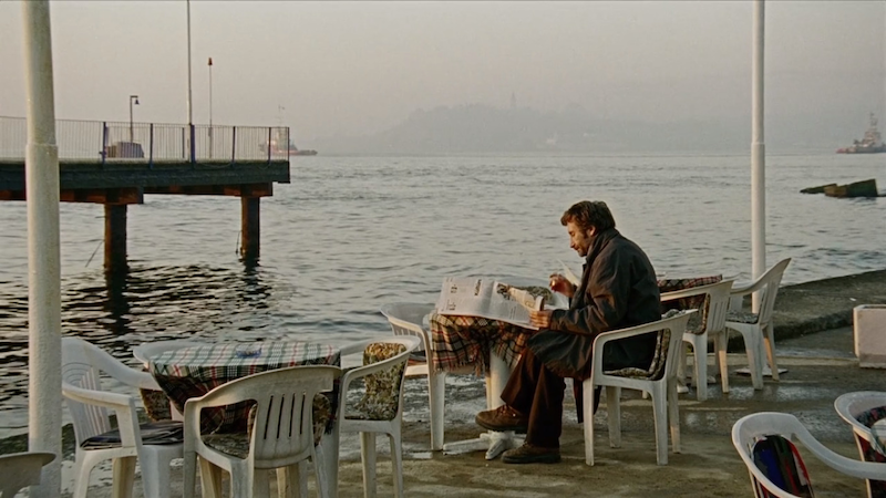 If I used Letterboxd, this film would go straight onto a list called, "Are Men OK?" In "Distant," Turkish filmmaker Nuri Bilge Ceylan's third feature, Yusuf (Mehmet Emin Toprak) travels to Istanbul to stay with his cousin Mahmut (Muzaffer Özdemir) while he looks for a job. In the wordless, opening scene of the film, Yusuf trudges across a snowy white expanse toward the camera. For a brief moment, he dips out of the frame as he climbs uphill to the side of the road. Breathing hard, he stops, looks back from whence he came, and exits the frame. The camera pans over to the empty road, stopping, waiting, and eventually, a car's headlights appear. As it grows closer, Yusuf steps back into view and sticks out a hand. From the jump, Ceylan lets the viewer know what kind of filmmaker he is: quiet, meditative, someone who lets blocking and camera movements (or lack thereof) communicate emotions. This opening scene perfectly sets the tone of the film, which is about two disparate figures who briefly come together physically but remain emotionally distant.