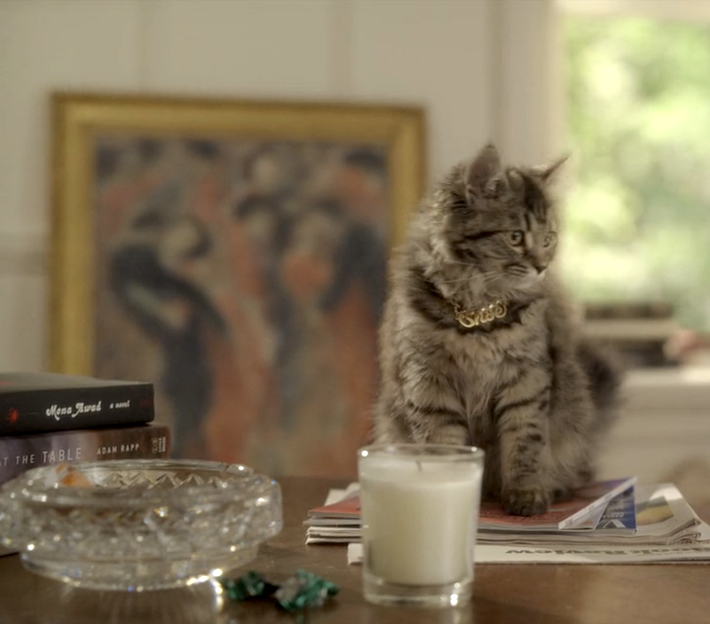 I know you might be wondering, "What's Shoe Bradshaw up to?" Well, first and foremost, she's thanking her lucky stars that Carrie failed to bring Wyatt Shaw into her home. She's annoyed that a) no one will let her go outside/eat rat poison and b) she's been forced into a mommy-and-me nameplate necklace moment. In retaliation, she's contemplating knocking a Diptyque candle onto the ground. Before she does it, she's sniffing to make sure it's Baies, Carrie's longtime favorite.