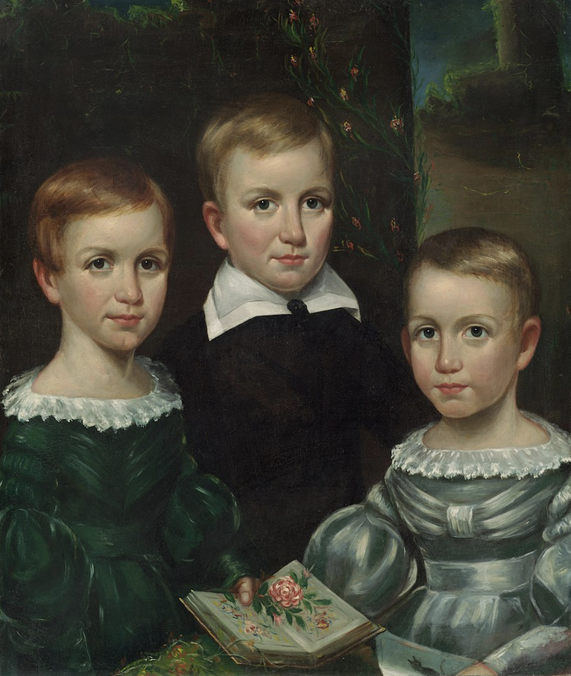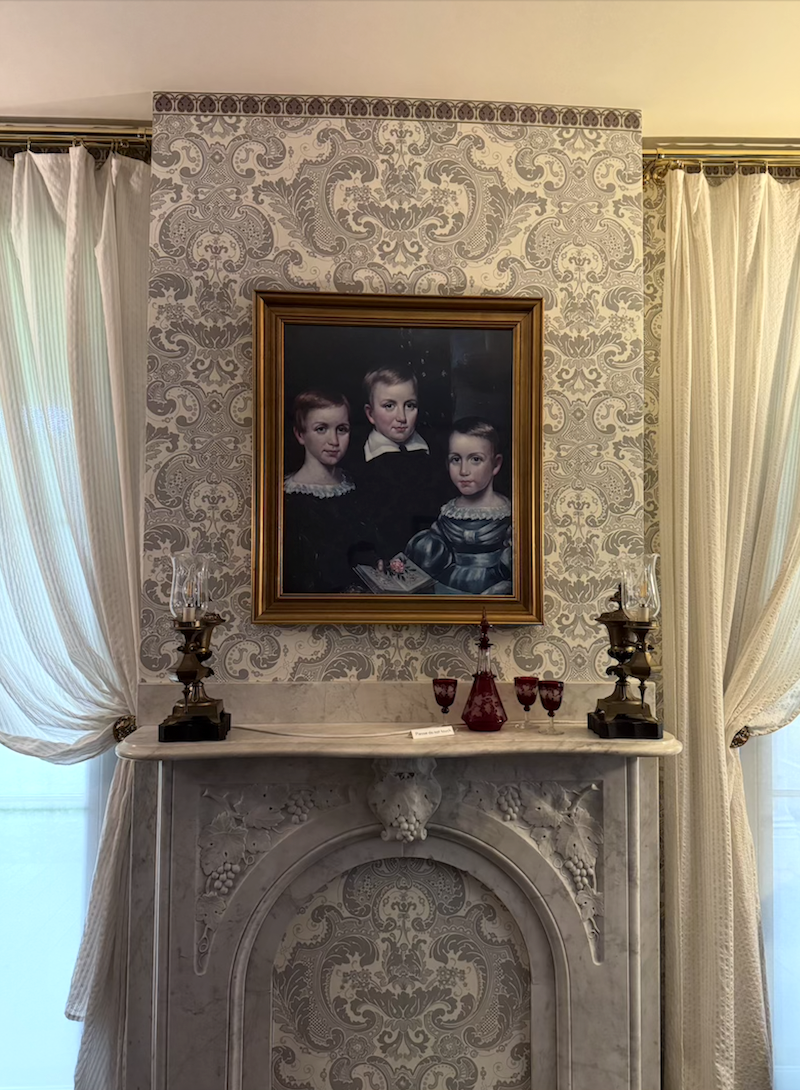 First, an update on my trip to the Emily Dickinson Museum: it was magic. I would have happily paid $20 just to stand in her bedroom, staring at the floral wallpaper, imagining her hunched over a tiny writing desk in the dead of night, thinking about death, as a candle flickers in its chamberstick. I sadly did not encounter any cats on the property, but I was pleased to learn that Lavinia's fondness for them harkens back to at least age 7. At first, this painting of the Dickinson children hanging in the parlor looks unremarkable. Like ok, cool, Emily loves to read, so she's holding a book. The frame hides an important secret, though. If you look closely at Lavinia's hand in the photo on the right, you'll see that she's holding a drawing of a little black cat.