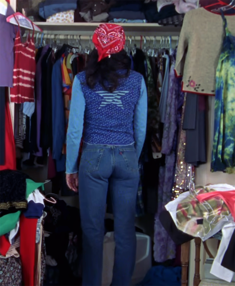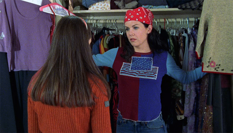 Lorelai's Americana tribute outfit in the opening scene would make Trump supporters everywhere proud. She's wearing a shirt that has a half red, half blue body and a dissected, glitter American flag graphic. The sleeves are lighter blue - for contrast, and to heighten the jigsaw puzzle nature of the overall "look," I suppose. The back of the shirt is solid blue, with a tiny blue star print and one, large, blue-and-white striped star graphic in the middle. If this sounds like a big mess and way too many competing elements all mashed into one top, then you are an astute observer/correct. The jeans are Levi's that are typical of the era. They might look good on a rail thin supermodel, but they do no favors for anyone with even a semblance of an ass. And let us not forget Lorelai's red, glitter-adorned bandana!