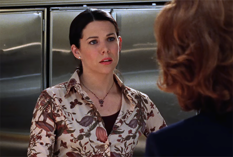 It feels too obvious to pick on Rory’s Oompa Loompa meets Alice Nelson getup, so I won’t. To be honest, it’s also not the worst attire on the episode. That award goes to Lorelai, who wears some of the most hideous shirts I’ve ever seen in this episode.