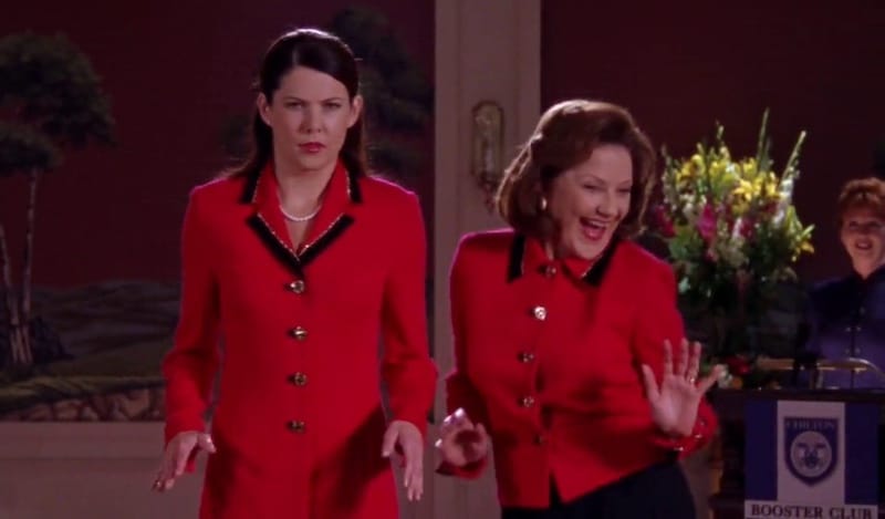 - The outfits in this episode are truly atrocious. I've never understood Rory's obsession with tiny, ill-fitting cardigan sweaters or Lorelai's preference for ruffled work shirts. Someone (ahem, Emily) should have nominated this mother-daughter duo for "What Not to Wear."