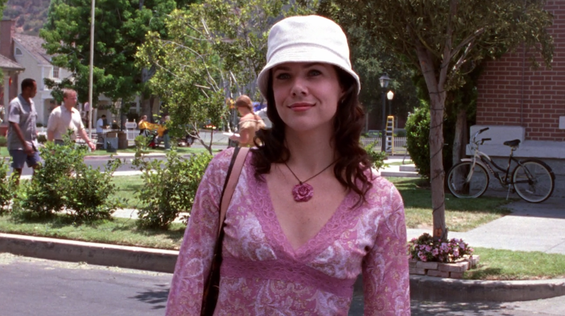 Lorelai is wearing a white, terry cloth bucket hat, a polyester caftan that definitely is not suitable for summer heat, an enamel rose necklace, a pair of gold kitten heels with a bow, and a black (maybe brown?) leather bag. She looks like Amber Mariens on meth and I do not approve.