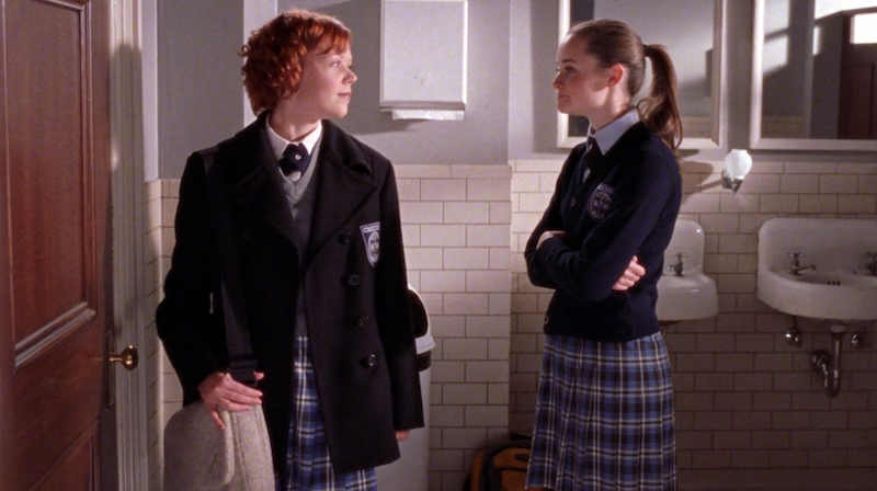 Later, Rory pulls her into the girls' bathroom and threatens her to back off in a kind of old-timey "now see here" kind of way. There's talk of the perfect liquid line and a bunch of references that only flamboyantly gay boys who watch a lot of Nick at Nite would understand.