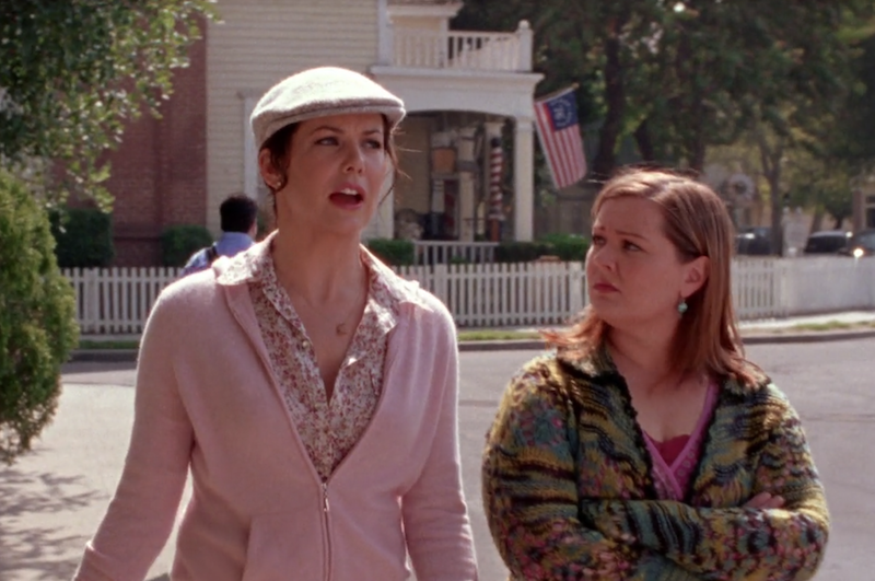 Who does Lorelai think she is, Samuel L. Jackson? This hat is so damn ugly that it totally distracts me from Sookie's middle school art project sweater.