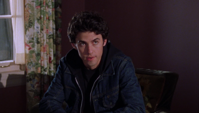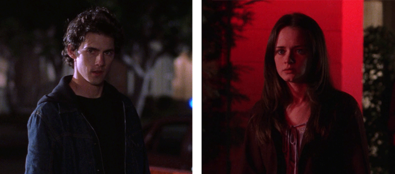 After Jess realizes that he isn't graduating, he doesn't tell anyone. Instead of confiding in Rory, he broods silently and treats her shittier and shittier as time progresses. When they first arrive at Kyle's party, he's annoyed that they've showed up early ("we're dork-early") and refuses to engage with anyone but Rory. He openly mocks Lindsay when she says she likes Michelle Branch and Matchbox 20 ... as if he's some paragon of culture and taste. When he disappears and Rory goes to find him, he's upstairs in one of the bedrooms. What transpires is upsetting.
