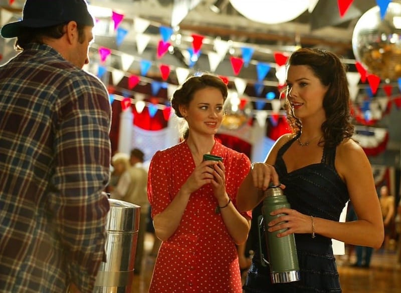 The Gilmores should dress like this all the time. The fabric cuts are flattering and their hair and makeup is flawless. Thankfully, the wardrobe department even decides to give Sookie a break! She wears a beautiful, long-sleeved floral number with slightly high shoulders and a tasteful v-neck. It might even be a wrap dress? I can't tell for certain.