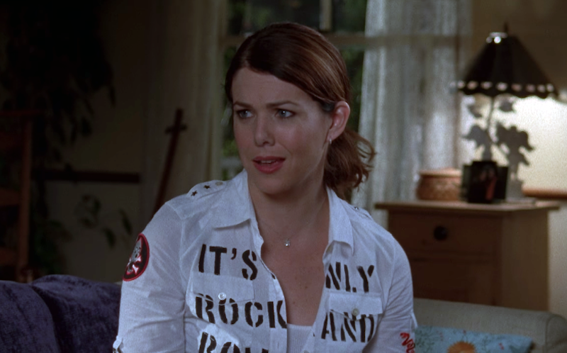 I don't know where Lorelai gets all of her ridiculous graphic tees and button-down shirts. This one says "IT'S ONLY ROCK AND ROLL TO ME" across the chest and has a bunch of skull patches on the arms. I'm surprised she's not wearing it with her beloved cross choker.