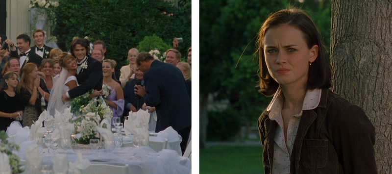 While Rory doesn't officially attend the wedding, she does lurk near a tree during the ceremony and watches Dean and Lindsay happily exit the church. I guess her face is sad/confused, although I'm not 100% sure what emotions Alexis Bledel is trying to channel ... painful poop? If my first serious boyfriend got married during my freshman year at Yale, I think my reaction would probably be, "Ugh, what a fucking loser. I'm so happy to have dodged that bullet." Rory is less judgmental than me, though.