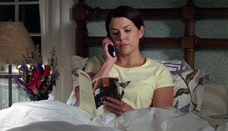 Lorelai is reading "Sailing Alone Around the Room: New and Selected Poems" (2001) by Billy Collins when Rory calls to tell her about Logan. I've never thought of Lorelai as a poetry person and wonder why this was chosen for her. Maybe it's a clever nod at what's to come as Luke grows increasingly distant.