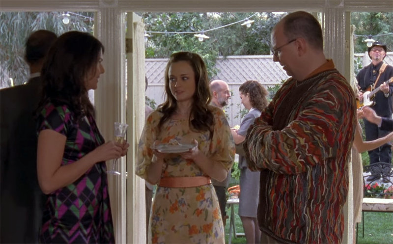 Only Lorelai Gilmore would wear a (too tight) court jester-print dress with a titty tie to someone's wedding. Paired with knee-high black suede boots, the outfit makes me question what season it is, especially next to Rory's Easter egg hunt/flower girl dress.