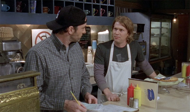 At the diner, Kirk berates Zack for letting the juice from his pickles leach over to his grilled cheese. Zack is about to grab a pencil and take notes on Lane's French fry dam technique when Luke declares, "It's all going to the same place inside that dark, strange body of yours, Kirk. Now eat it." This brief glimpse of OG grouchy (but not bitter) Luke makes me think of what could have been had April not caused a glitch in the matrix. Luke has been a shell of his former self since mid-S6 and it's nice to see him revert back to his pre-hideous polka dot tablecloth days.