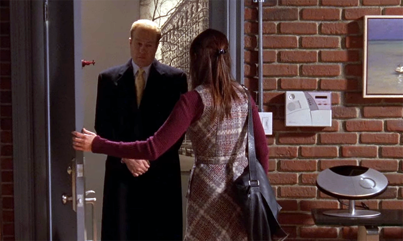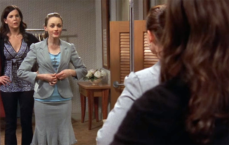 Every blazer Rory tries on in the opening scene is at least one size too small. She should have taken Emily shopping with her instead of Lorelai. Say what you will about her penchant for tweed, at least Miss Celine taught her the power of impeccable tailoring. Also, I refuse to believe Emily would exit the room with a raw food evangelist who dresses like this: