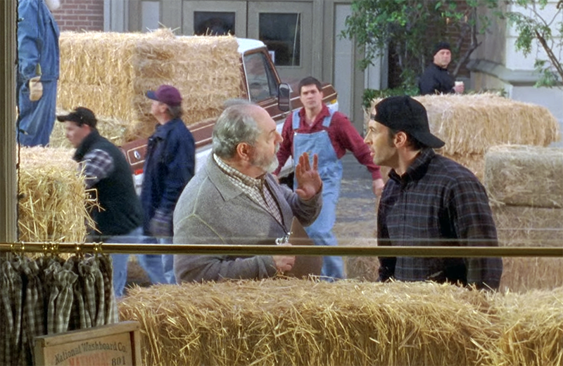 Taylor cons the town into spending the entire Spring Fling budget on a hay bale maze because it was apparently his childhood dream to visit one. As Michel says, "Don't they have lives? Don't they have televisions and elliptical machines? What kind of weirdo wants to walk around in a maze of hay?" It turns out, everyone does because the entire town fucking loves it. Luke is initially pissed when he sees hay bales piling up in front of his diner, but he and Zack work out a system for delivering orders amidst the chaos. I respect Kirshner's writing, but the Luke/Taylor scene should have gone more like this: