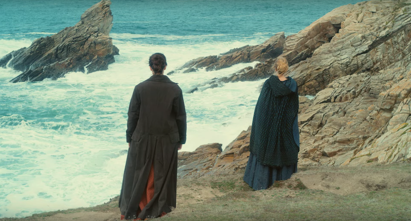 From the jump, it's obvious that Marianne fends for herself and suffers no fools. We see her travel on a small boat across choppy waters to a remote location in Brittany, France. At one point, her parcel (which we later learn contains canvases) falls overboard. She dives into the freezing ocean to retrieve it without waiting for a crew member to help her.