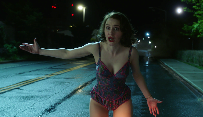 Midge alternates between silence and morose laughter while Susie tries to figure out what the fuck to do. When Midge throws her hat out the cab window, Susie asks, "Miriam, do we need a pill?" Where's Paris Geller and her grab bag of drugs when you need her? As Midge's manic anger intensifies, she starts taking off the rest of her clothes and tossing them out of the moving cab. The scene culminates with a bodysuit-clad Midge grabbing a large tree branch and smacking the hood of the cab before getting into a slap fight with Susie. It's all wonderfully unhinged and a great way to visualize Midge's inner turmoil. Had we gotten to see Luke Danes beat up Nicole's lover's car, I imagine it would have looked something like this (sans nakedness).
