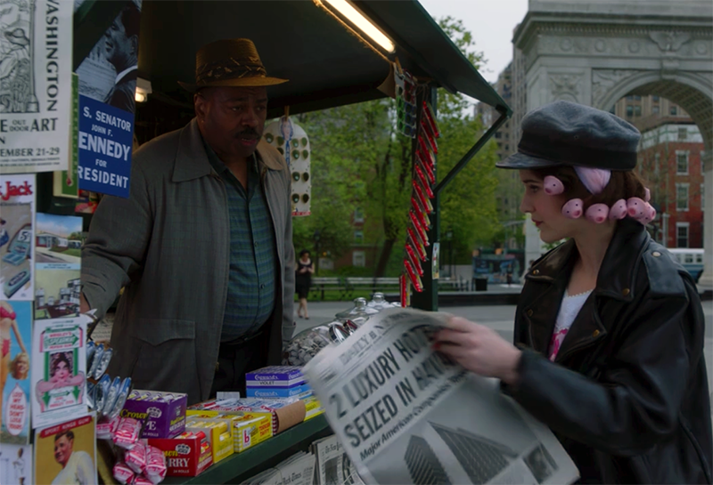The next morning, Midge dons Susie's leather jacket and newsboy cap as she runs out to Washington Square Park for a paper. Flipping through the pages, she learns that Shy has replaced her with another comedian named Jack Ballard. In a frenzied panic, she rushes back to the Gaslight to inform Susie that the writer L. Roy Dunham (who I assume will be played by Milo Ventimiglia) is now on her shit list.